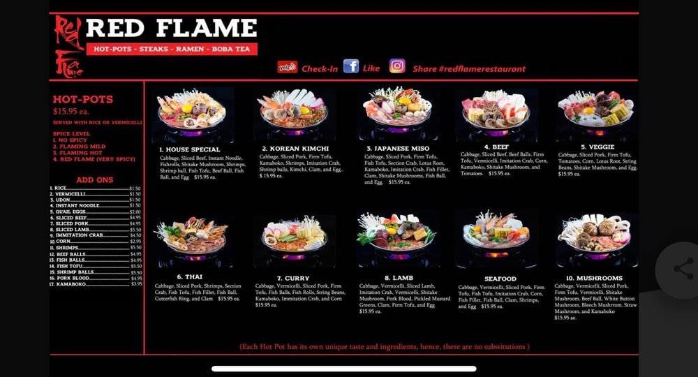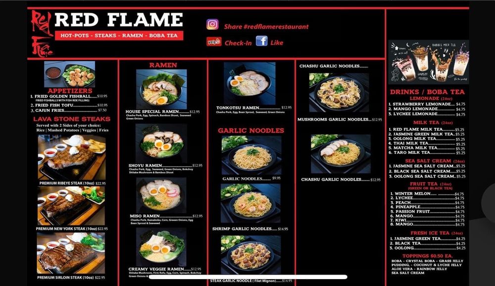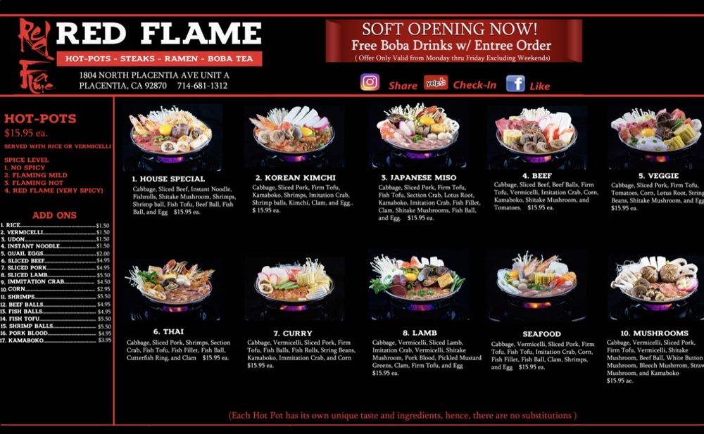 Red Flame is a versatile dining spot, offering a unique blend of steakhouses, ramen, and hot pot. Located in Placentia, CA, this women-owned establishment provides a range of amenities from takeout and delivery to waiter service and catering options. With a casual atmosphere and ample vegetarian choices, Red Flame is ideal for group gatherings or a cozy dinner. Customers praise the attentive service and clean, modern ambiance. The menu boasts a variety of dishes, such as creamy veggie ramen and flavorful hot pot options like the house special. Prices are affordable, with generous portions of steak served with sides and salad. Overall, Red Flame promises a satisfying dining experience with impeccable value and delectable flavors.